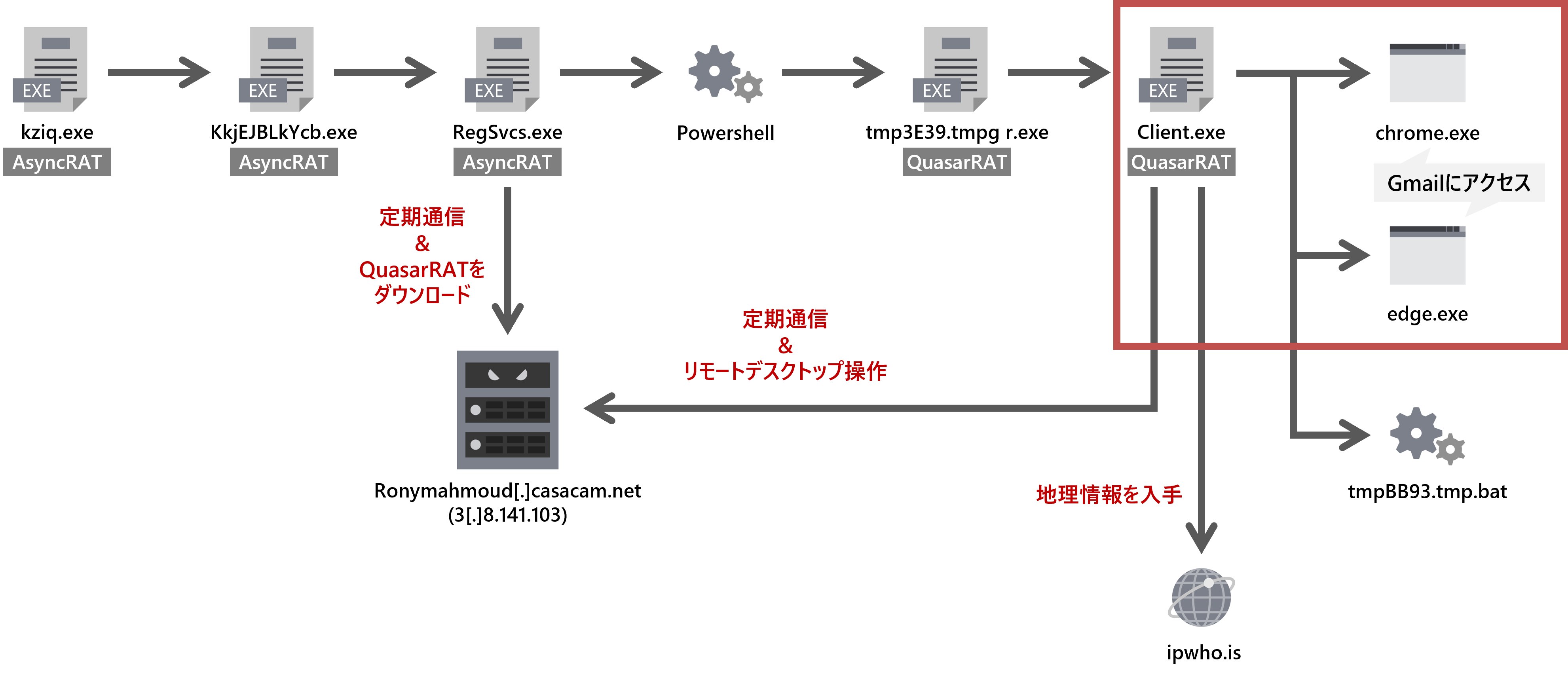 また,AsyncRAT自体がリモートデスクトップ機能を備えているにも関わらず,2次検体としてQuasarRATをダウンロードしてリモートデスクトップ操作を行った理由については,①AsyncRATが検知・除外されても攻撃を継続できるように別ファミリのRATをダウンロードした,②攻撃者は今後別のキャンペーンでQuasarRATを利用する計画があり動作テストを行っている,③AsyncRATの攻撃者はイニシャルアクセスブローカーの一種で,他の攻撃者に感染端末へのアクセス権を販売することで利益を得ておりQuasarRATは他の攻撃者に提供するRATとして導入された,といったことなどが考えられますが,正確な目的は今回の観測では特定できませんでした.