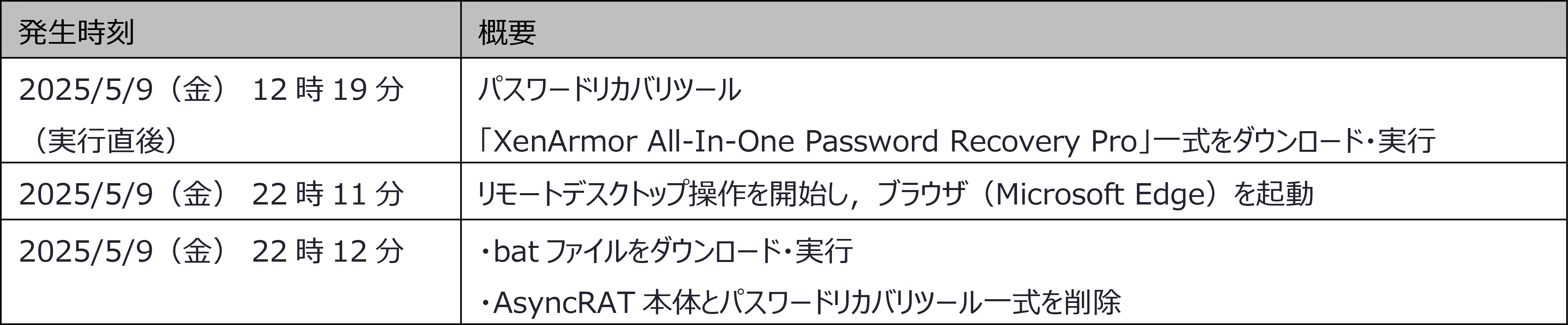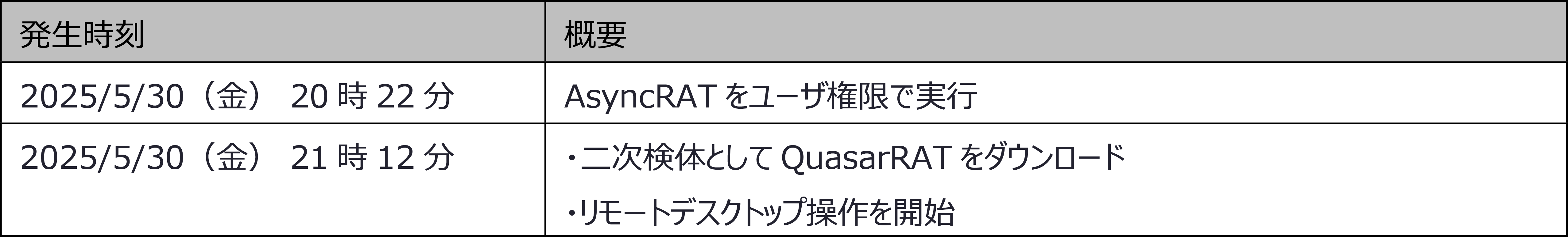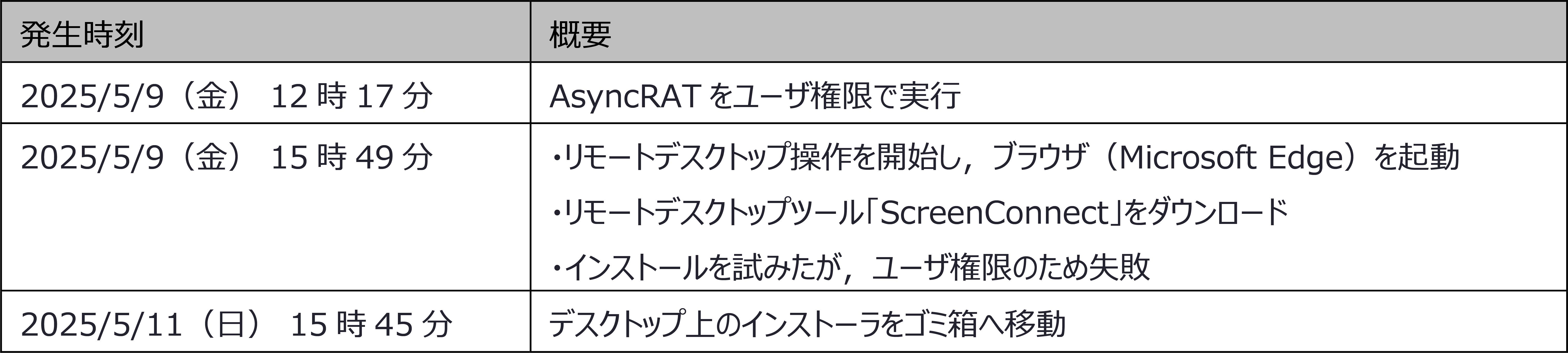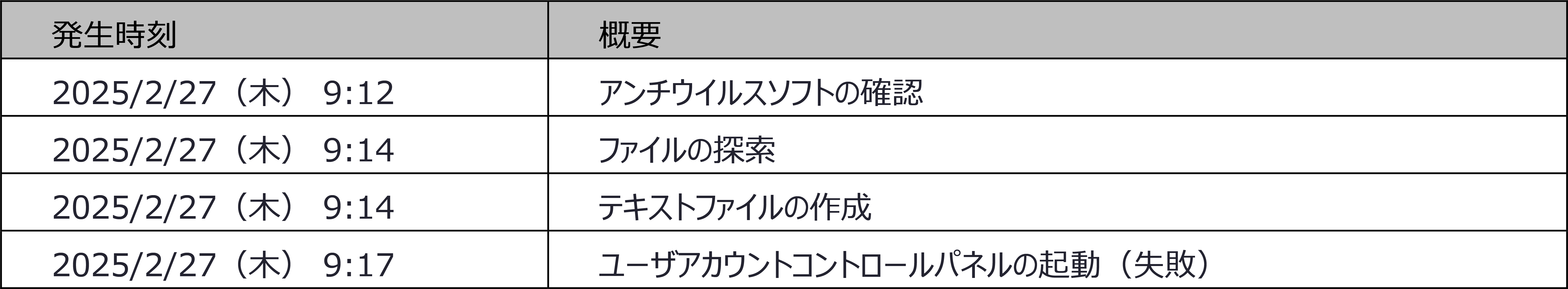 1件目は,2025年2月27日(木)に観測を行いました.検体の挙動の概要を以下の表に示します.検体実行の2分後からリモートデスクトップ機能によるマウスの遠隔操作が開始され,4つの挙動が確認されました.